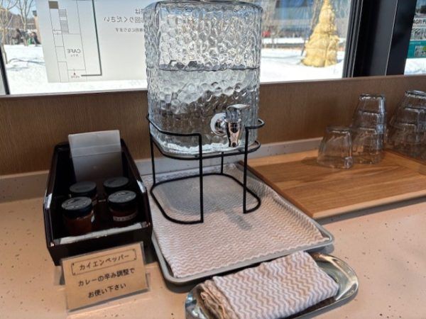 お水もセルフサービスで。カレーの辛さ調整にカイエンペッパーもありましたよ。