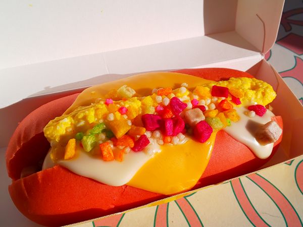 赤と白の色合いで映画「シュガー・ラッシュ」のレースコースをイメージしたスペシャルホットドッグ(チーズ&エッグ)。カラフルなトッピングは野菜のクルトンで、エッグサラダとチーズの味わいもマッチしています。フレンチフライポテトとソフトドリンク付き。