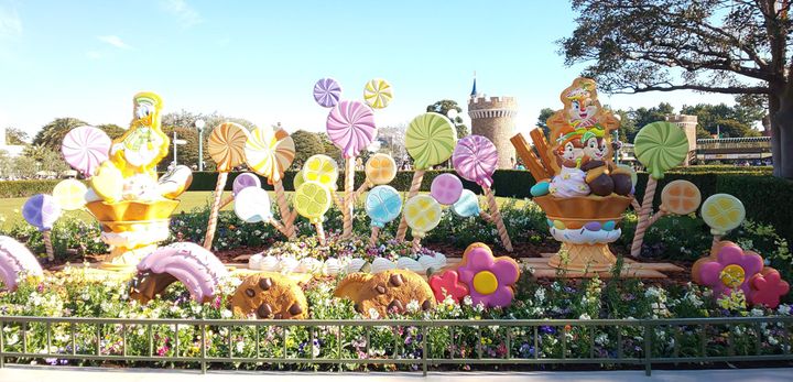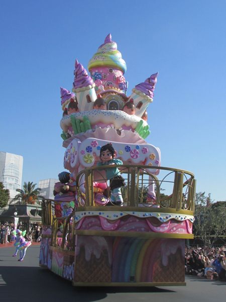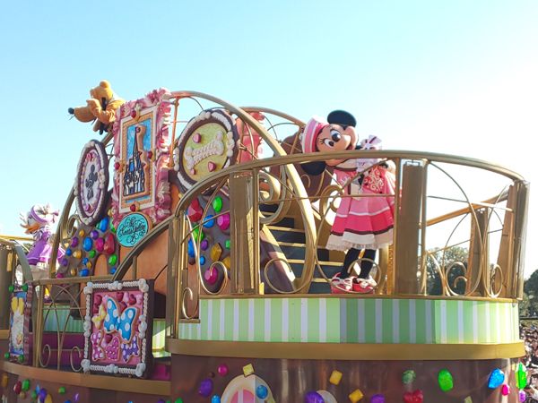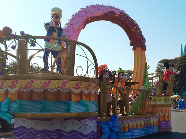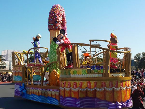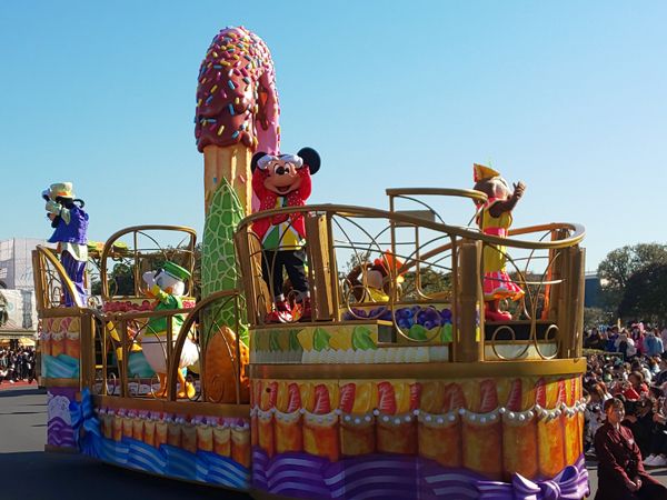 昼のパレードではお菓子のフロートに乗ってディズニーの仲間たちが登場