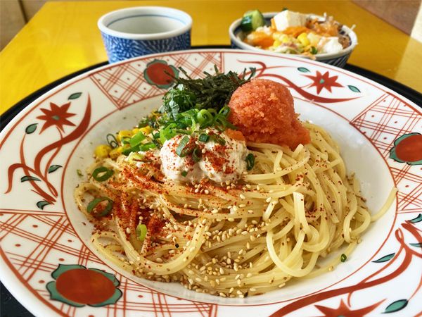もちろん、スパゲッティーも申し分なし。パスタの上に明太子とマヨネーズの玉がちょこんとのっているビジュアルがなんともキレイ! 大葉や海苔もトッピングされています。