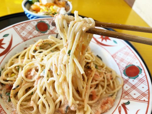 正直なところ、箸を使ってスパゲッティーを食べるのって、ちょっと難しいな…と思っていました。でも、麺のもちもち感や麺とソースとの絡み具合を、くちびるでしっかり感じながら食べられるのは、箸で食べるからこそ快感かもしれません。