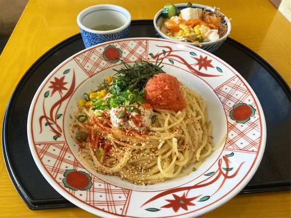 「明太子とマヨネーズのスパゲッティー」(スープ付き)1150円、「サラダバー」300円