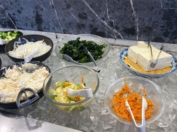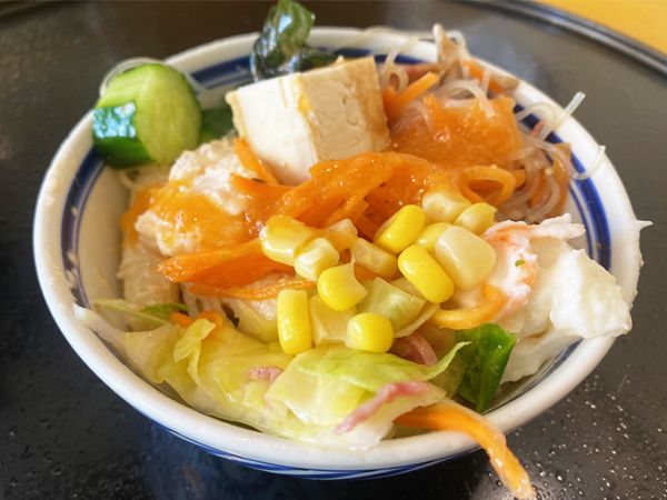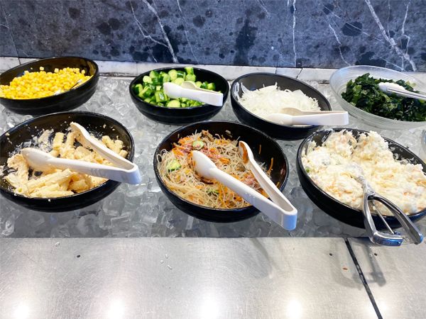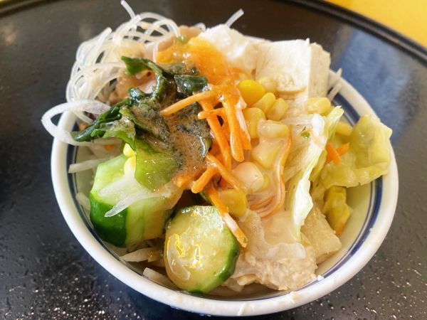 サラダバーのお皿は小ぶりの器ですが、深さもあります。全部の種類を入れたくなりますが、まずは千切りキャベツ・ダイコンをベースにトッピングをいくつか。野菜はどれもしゃっきりとした歯ごたえ。ワカメや豆腐の食感、キャロットラペやキャベツの酢漬けの酸味もいい塩梅でした。春雨サラダやマカロニサラダ、ポテトサラダなど、さまざまな味付けされたトッピングがあるのも変化があって良かったです。自分が満足いくまで食べられるのは、やっぱり楽しかったです。