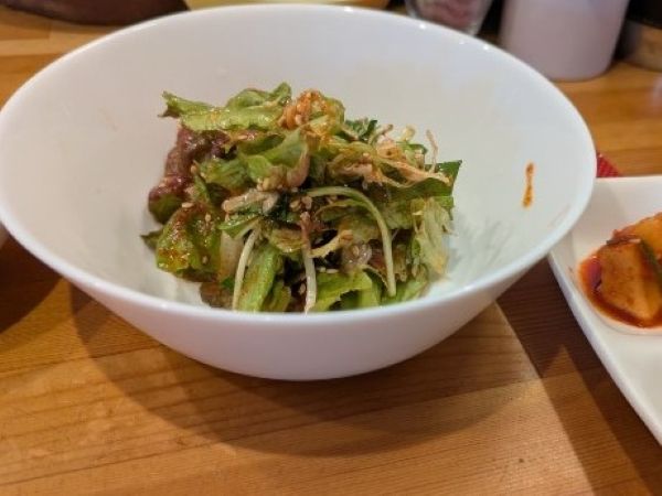 今回一番印象に残ったのが、チョレギサラダ。私が想像していた味とは違い、ピリッとした辛味と酸味のバランスが絶妙でクセになる味わいでした。チョレギサラダに使われているこのドレッシングは、店内で1本700円で販売されています♪家でもこの味を楽しめるのは嬉しいですね!