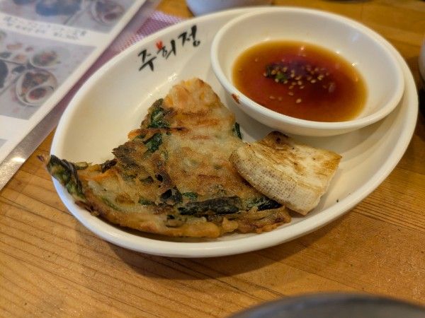 香ばしいチヂミと焼き豆腐。お手製のたれもおいしい!