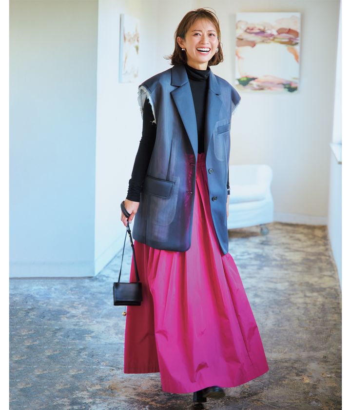 5位 【40代のピンクコーデ】主役スカートに辛口ジレを合わせて凛と華やかに