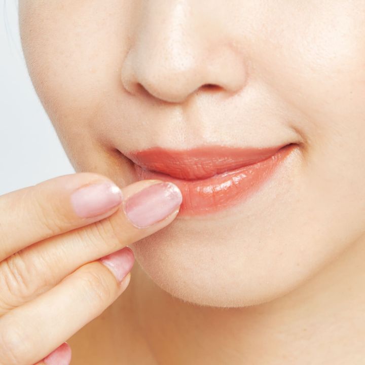 大きめな唇には直塗りはせずに指の腹を使用してポンポンと塗布。輪郭をぼかすことで悪目立ちはせずとも印象的な口元に。