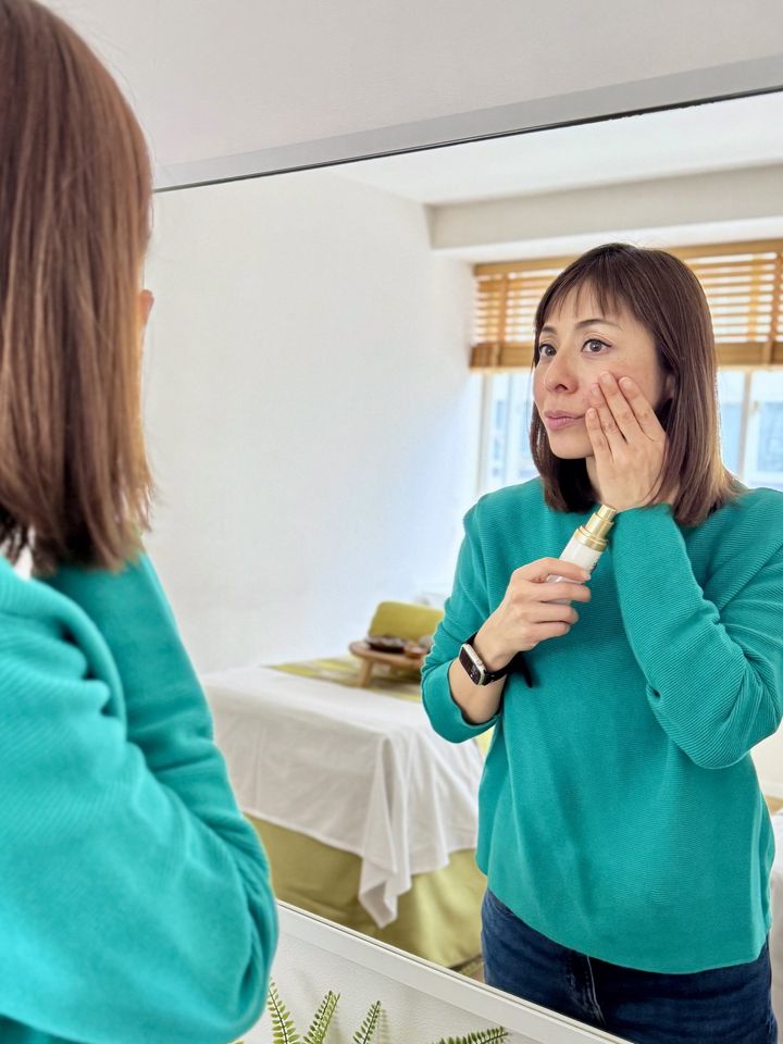 理想の肌は、適度なツヤハリのある肌。最新の美容医療の力も存分にかりながら、不自然にならないために、セルフケアと医療のバランスが大切だと考えています。毎月のお手入れは、プロの手もかりています。自律神経にも効果的なヘッドスパや、若々しい姿勢のためにピラティスも定期的に通っています。