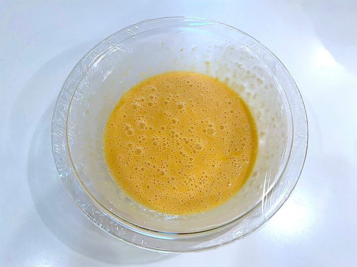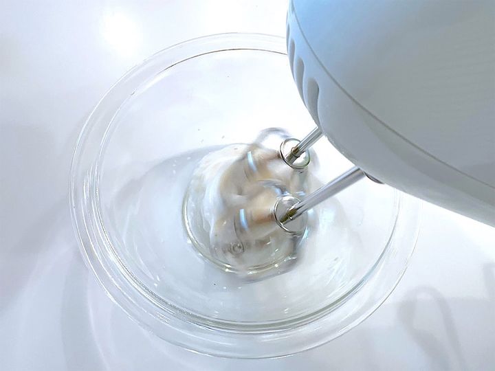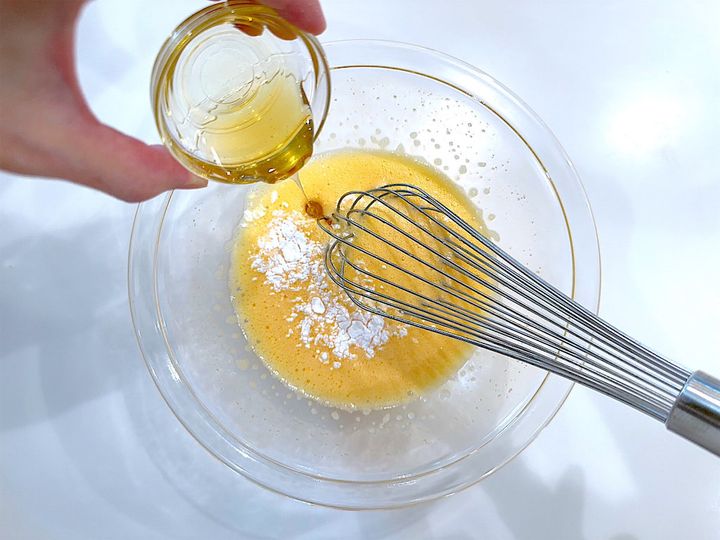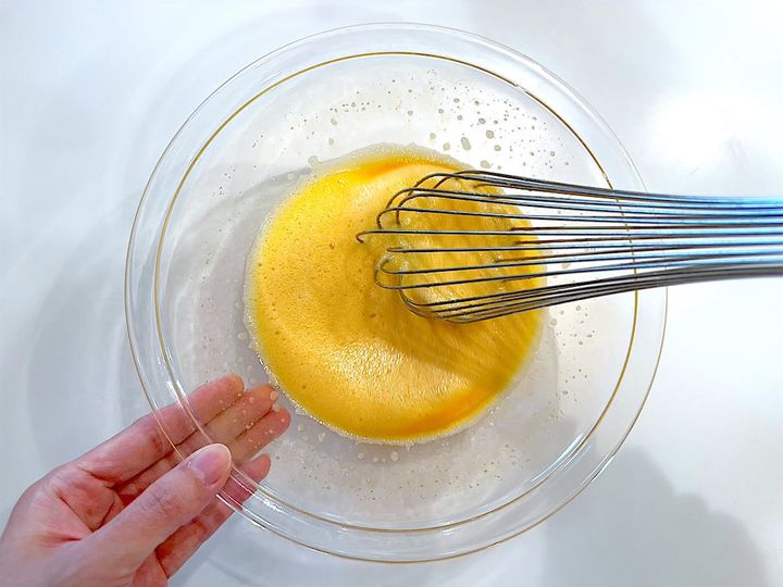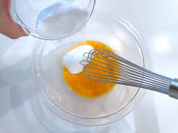 1.卵はよく溶き、砂糖を2〜3回に分けて加え、白っぽくなるまで混ぜる。