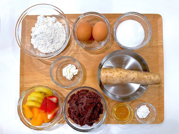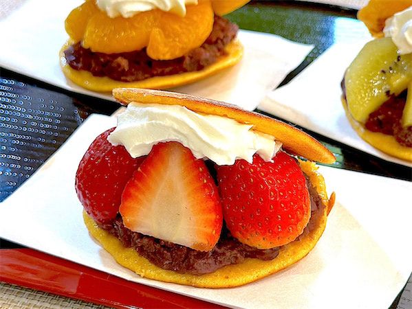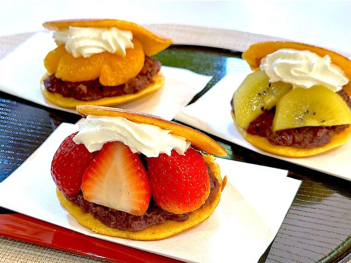 今回は「変わりどら焼き」ということで、あんこの他にも、生クリームとフルーツをサンドし、今風に仕上げていきます。