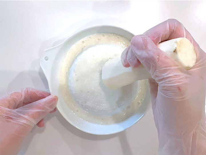 4.長芋は皮を剥いてすり下ろし、泡立て器で泡立てる。