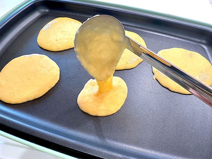 6.130℃に温めたホットプレートにサラダ油を薄く引き、5の生地を等分し、円形になるように流す。
