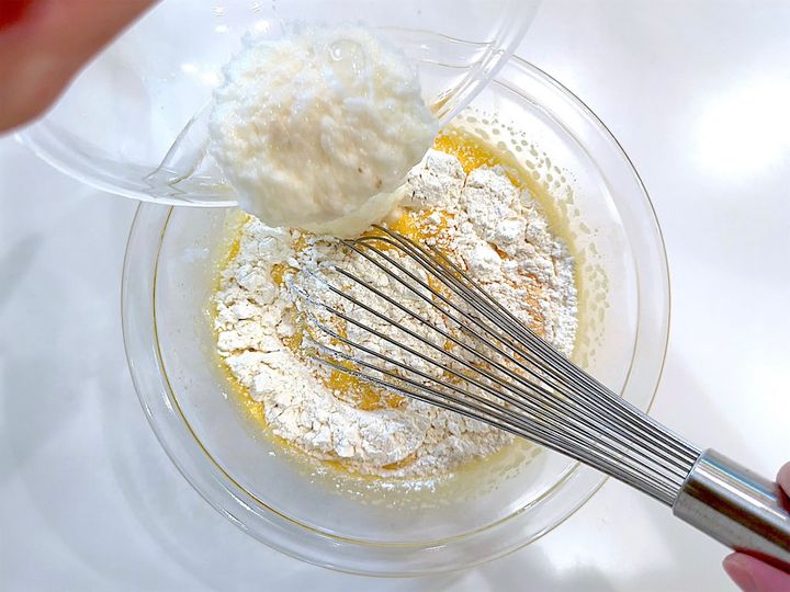 5.2に薄力粉と長芋を加え、もったりするまで混ぜ合わせ、ラップをして20分おく。