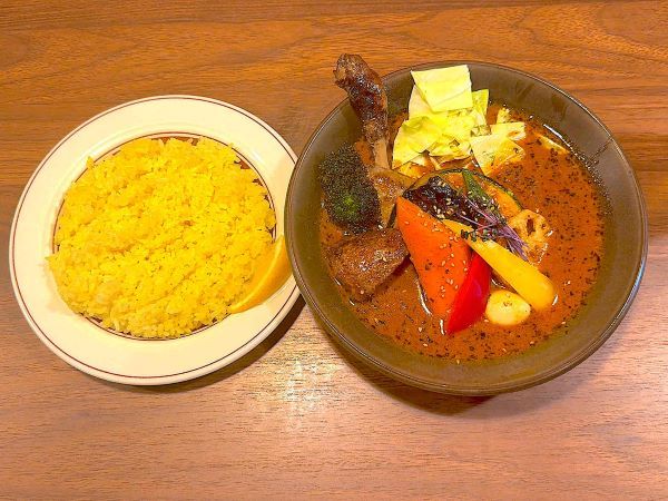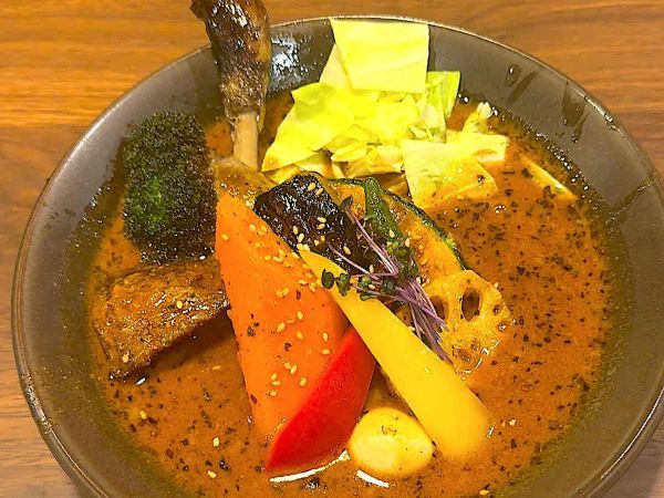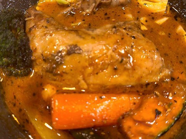 骨付きチキンと彩り豊かな野菜がたっぷり詰まった贅沢な一皿です。スパイスの香りが食欲をそそり、一口ごとに深い旨味が広がります。スパイシーな香りが食欲をそそります。 スープカレーの食べ方は、ライスをスプーンですくい、スープに浸して食べるのが王道です。スープとライスのハーモニーを楽しみながら、じっくりと味わってください。