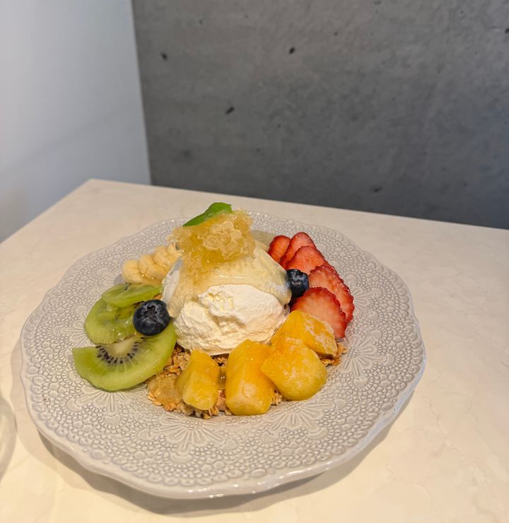 もったりとしたグリークヨーグルトにマンゴー、キウイ、バナナ、いちご、ブルーベリー、蜂蜜がトッピングされたものになります🍯