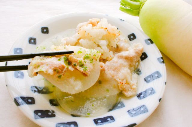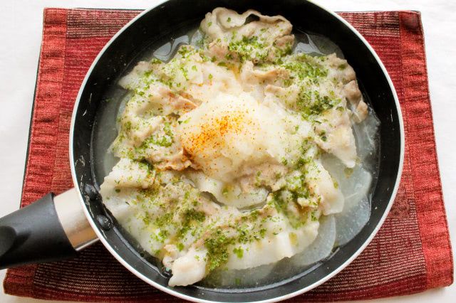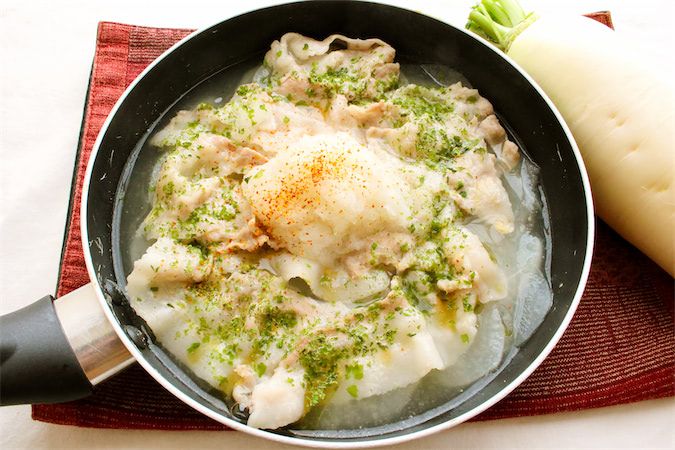 今回試してみる「最高においしい大根の食べ方」は、大根としゃぶしゃぶ用の豚バラ肉を、薄めた白だしで蒸し煮にする一品。すりおろししょうがと一味唐辛子を加えるので、体がぽかぽかと温まるようです。