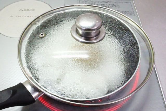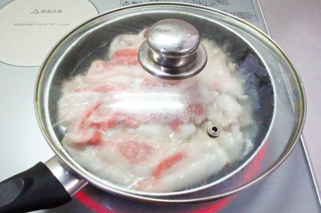 3. 豚肉を乗せたら再びフタをし、豚肉の色が変わるまで煮ます。