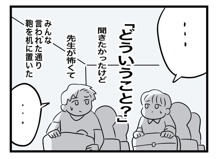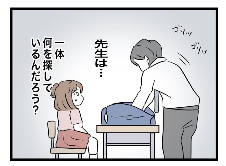 わけもわからず、子どもたちは先生に言われるがまま、かばんを机の上に出しました。先生は一人一人のかばんの中身をチェックしていきます。そして、ついにツムママさんの番がやってきたのです。