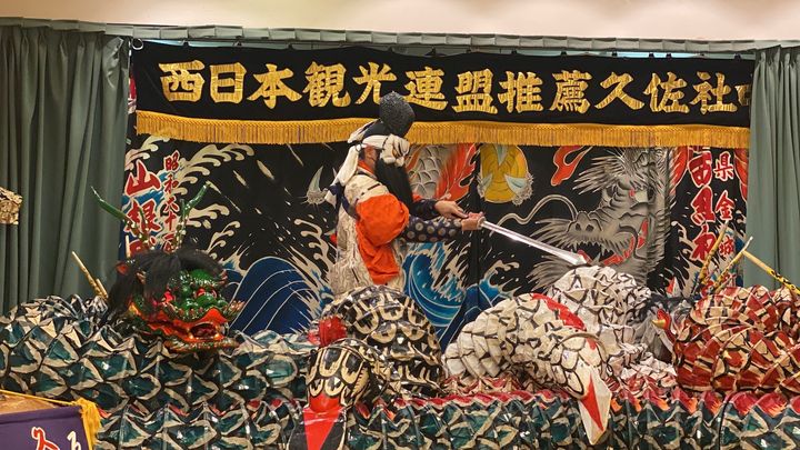 古来より石見地方に伝わる伝統芸能が、日本遺産にも登録されている石見神楽。日本神話を題材に、豪華絢爛な衣裳と観る者を圧倒するダイナミックな演出が観客を興奮の渦へと巻き込みます。演目は神様を迎えるための儀式舞や、古事記や日本書紀をもとにした能舞など30以上にものぼるのだとか。その中でも特に代表的な演目が、須佐之男命が八岐大蛇を退治する「大蛇」。とぐろを巻きながら襲いかかる大蛇と、剣で果敢に立ち向かう須佐之男命との壮絶な闘いは大迫力!