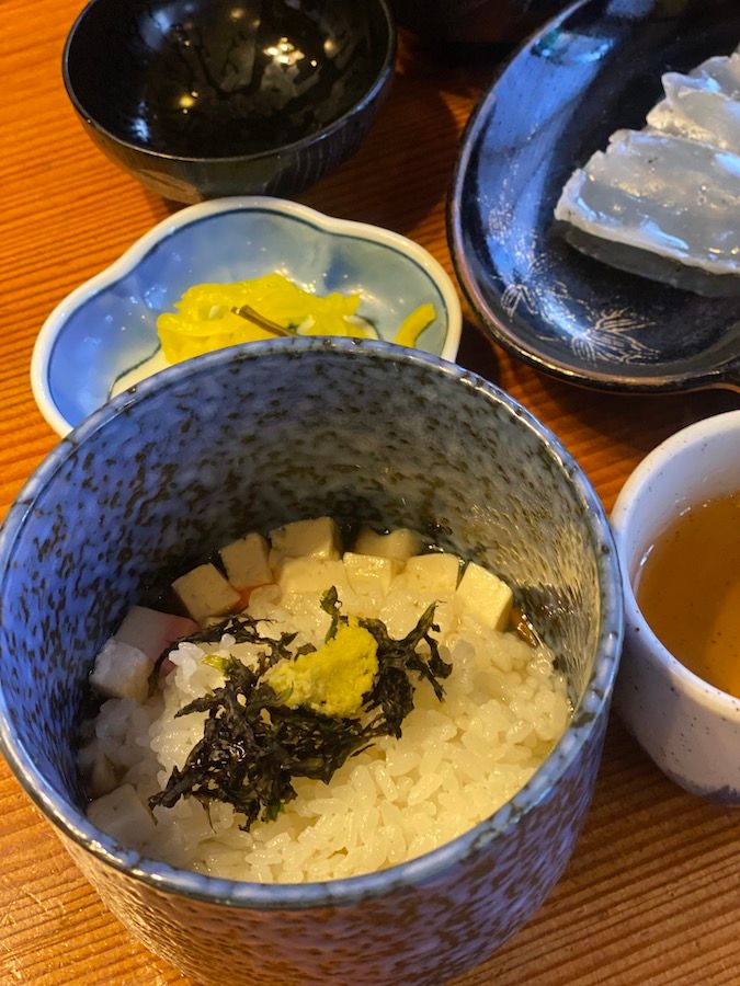 地元の山菜や川魚を使った料理が楽しめる「郷土料理 遊亀」のうずめ飯。津和野名物であるうずめ飯は、ご飯の下に小さく刻んだ具材を隠しているのが特徴。お茶漬けのように出汁をかけていただく。