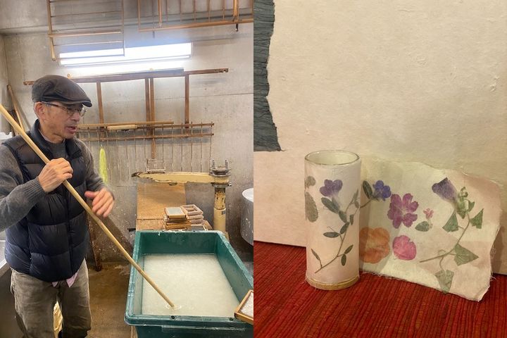 「石州勝地半紙」の工房では、そんな手漉き和紙の紙漉き体験をすることができます。園内で摘んだ草花を和紙に漉き入れて作るはがきは、ミニランプに仕上げることも◎。世界にひとつのインテリアは、愛着もひとしお。工房では6代目の佐々木誠さん自らが工房を案内し、和紙の歴史について丁寧に説明してくれる。