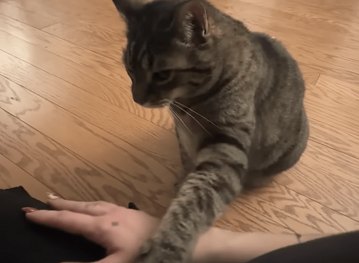 3. 飼い主さんの手をつかんで可愛い甘え方をする猫さん