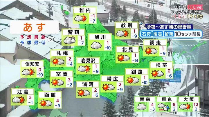 札幌や小樽で未明まで雪が降りますが、日中は広く晴れるでしょう。気温はほぼ平年並みです。寒いとはいえ、気温はプラスになるので、積雪が多い地域では泥はねにも注意して下さい。