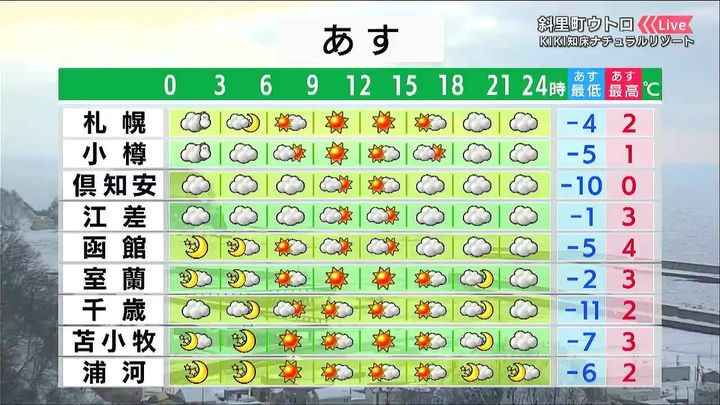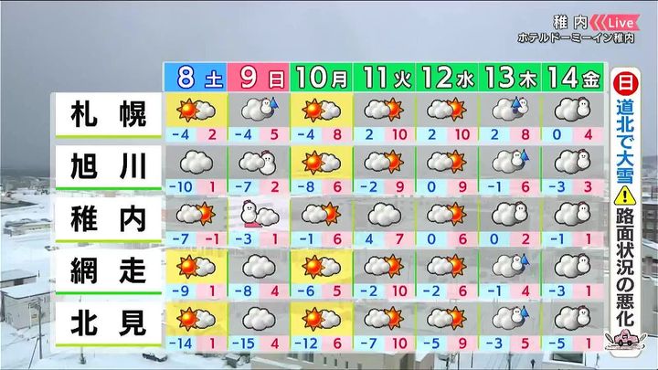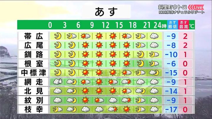早朝は網走から斜里町にかけて雪が残りますが、日中は道東を中心に晴れる見込みです。北見の最低気温は7日朝より8度低い‐14度の予想です。