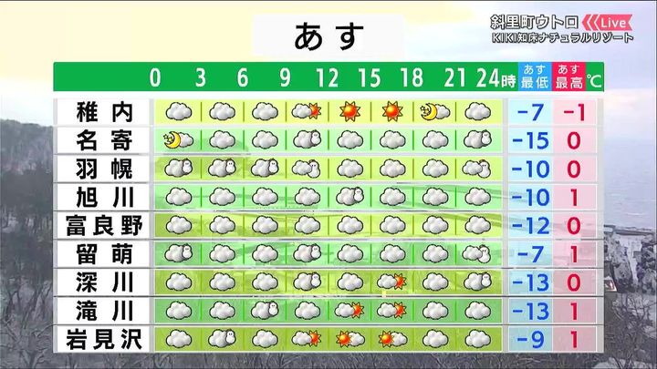 雲が広がり、ところどころで雪が降りますが、雪の量は少ないでしょう。朝の冷え込みが強まり、名寄は‐15度、旭川は‐10度まで下がります。