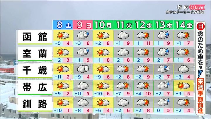 日曜は道南方面で雪や雨が降るため、外出には傘があると安心です。月曜日から寒さが緩んで、来週は季節が前進するでしょう。