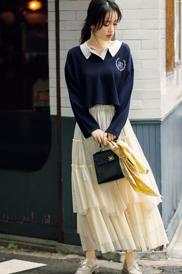 スポーティなラガーニットをチュールスカートでレディに誘導。ほどよくスポーティ要素を加えられるスキッパーやポロニットは、プレッピースタイルの筆頭役。糖度を上げるために、ボトムはフレアスカート合わせがマスト! 短丈のラガーニットには、動くたびふわりと揺れるチュールスカート合わせで、甘さをしっかりと投入して。