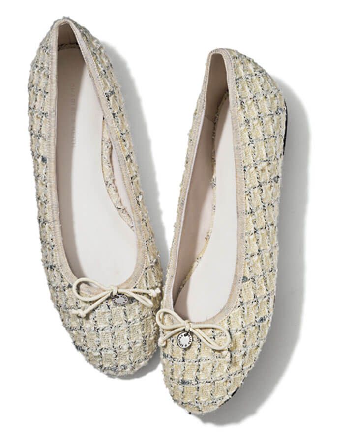 フレンチなバレエシューズとツイードは相性抜群。色ものももちろん可愛いけれど、あえての白で〝清楚感〟を存分に演出しても◎。