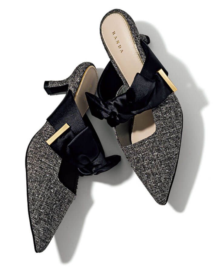 グレーのツイードに黒のリボンと、ほどよく辛めなデコラミュール。大きなリボンでも大人っぽいイメージで、デートでも女子会でもウケは必至。