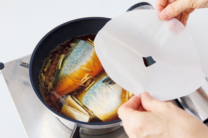 さばはやや強めの火加減で、落としぶたをして煮ます。こうすると切り身の上面にも煮汁が回るので、上下を返さなくても均一に火が通ります。