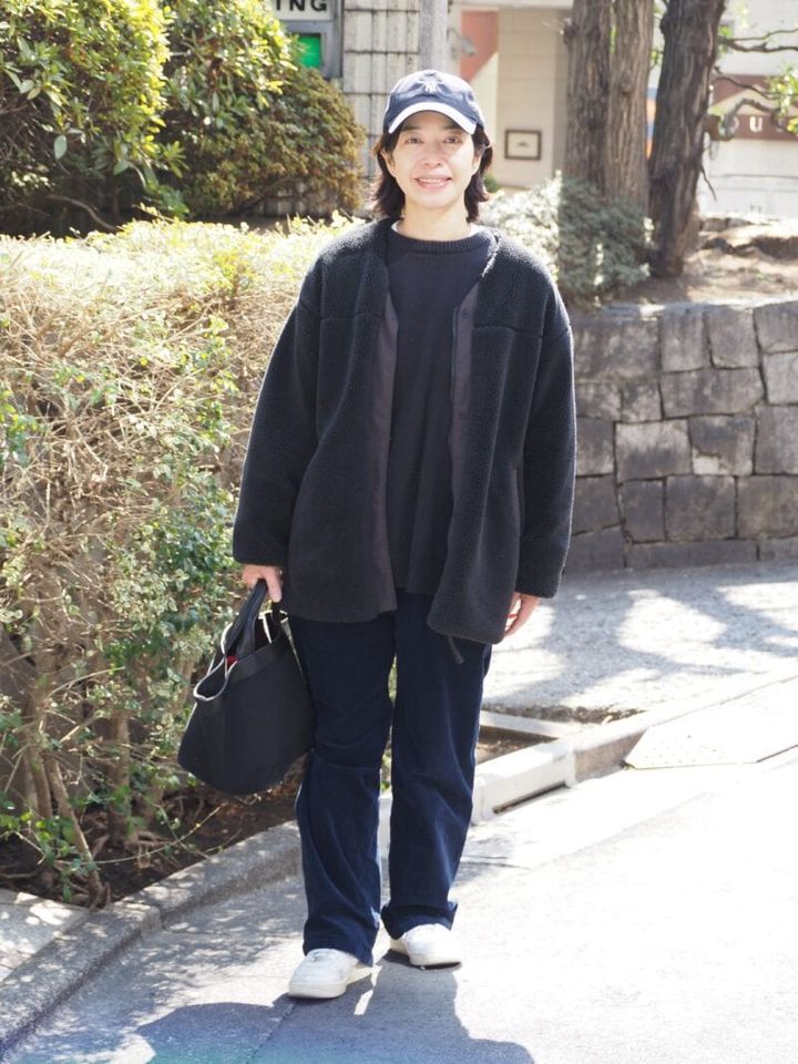 「ニコアンド」のボアジャケットに合わせたのは、セールでゲットした「無印良品」のベロアパンツ。寒さが続く晩冬は、暖かみのある素材をミックスしてほっこりと。