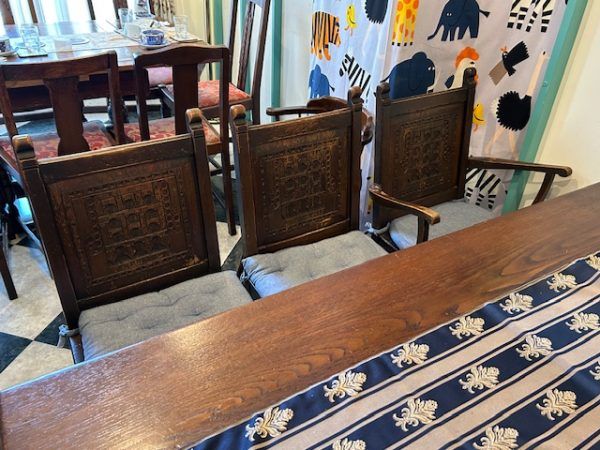 落ち着いた壁の色とアンティークの家具が迎えてくれます。アンティークの椅子やテーブルも素敵です。 思わず撫でてみたくなる木の風合いが暖かい。