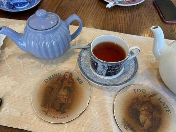 ティーポットを持ち上げると、下に敷かれていたティーポットマットにはテニエルのイラスト「不思議の国のアリス」が。ポットの熱と年季のせいでしょうか?アンティークの色味が増しているようです。Alice's Shop Oxfordの文字がなんだか遠いイギリスから旅してきたような距離を感じさせます。 アリスのお茶会の雰囲気をアンティでいかがですか?