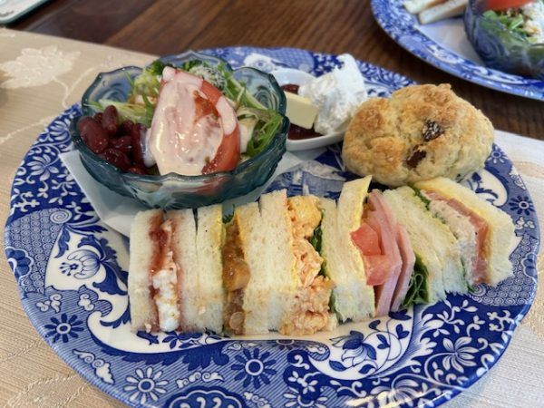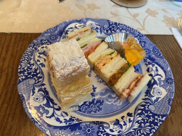 今日はランチタイムにお邪魔したのでガッツリ食べましょう。 ということで、わたしはハイティーセットにしました。ケーキを選べるのですが、絶対のおすすめは「ミルフェ」とのこと。選んで正解!パイってボロボロこぼれてバラバラになって食べにくくてあまり外では食べないのですけど、生地がしっとりしていてとても美味しかったです。ハーフサンドもあっという間に食べてしまいました。ポットにたっぷり淹れられた紅茶、こんなに飲めるかな?と思いましたが全部いただきました。
