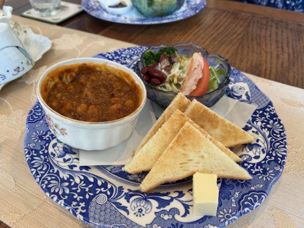 こちらは、今月(2月)のランチ、チリコンカーン。添えられてるトーストがいかにもイギリスという感じです。あの薄くてこんがり焼けたサクサクのトーストは、やわらかくてもっちもちの日本のトーストとは対極にありますね。どっちも好きですけど。