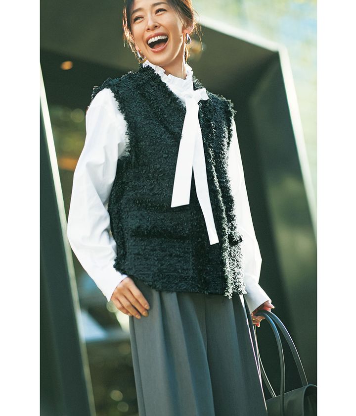ラメジレ×リボンタイ合わせが、フォーマルスタイルの新定番。垂れるタイが甘さの中にも凜としたイメージを。ラメツイードのジレが親しみやすい抜け感を出してくれる上級者スタイル。