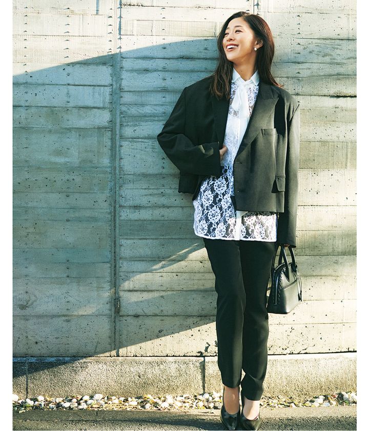 ブラウス¥75,900(コート/イザ)ジャケット¥37,400(プランクプロジェクト/プランクプロジェクト 青山店)パンツ¥22,000(エンフォルド)バッグ¥104,500(メゾンヴァジック/ヴァジックジャパン)パンプス¥137,500(ジャンヴィト ロッシ/ジャンヴィト ロッシ ジャパン)ピアス¥52,800(MAAYA)