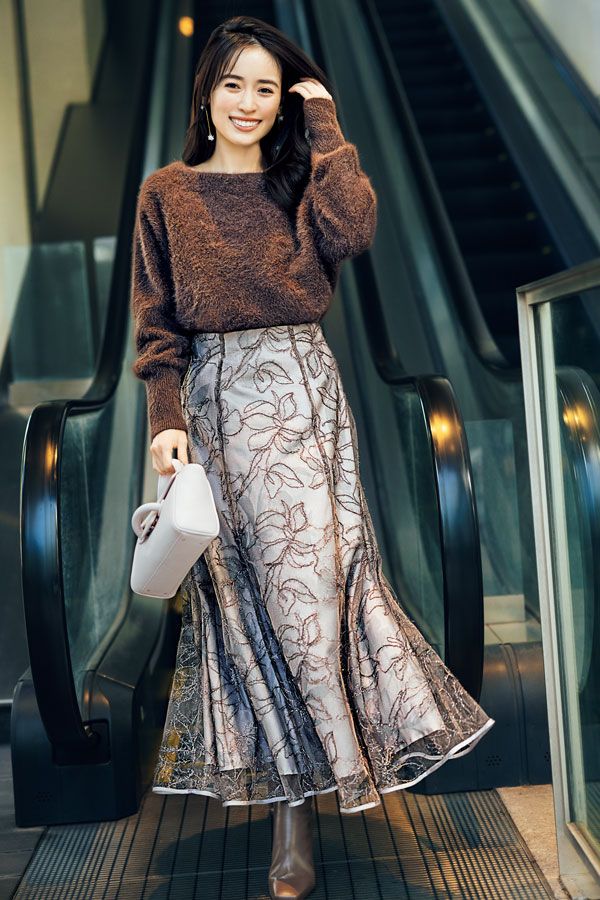 モヘアニットのふわふわ感と、きらめきを添えた刺しゅうスカートで華やかに。デートの期待は匂わせつつ、シックな色みで上品に。
