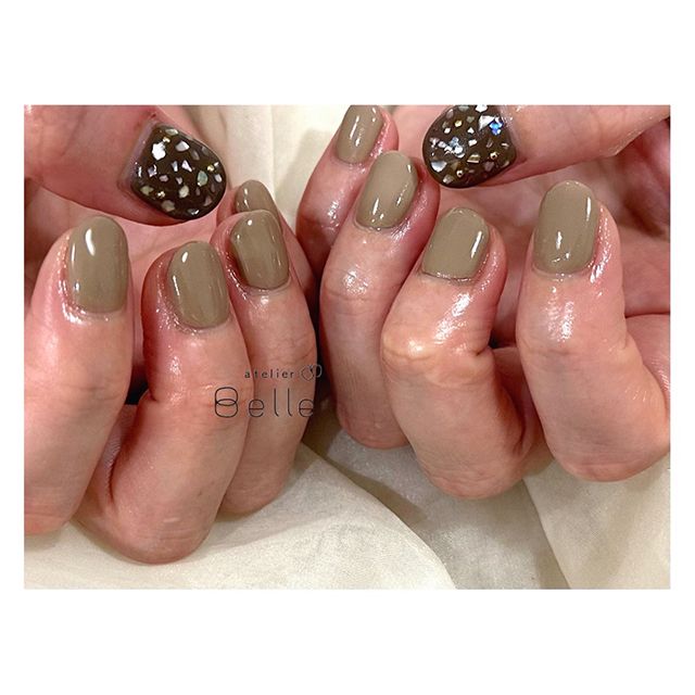 こっくりしたブラウンカラーのネイルに細かなシェルを散りばめるとお洒落で印象的な指先に!