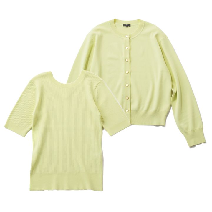 フレッシュなイエローで装いがパッと華やぐハイゲージニットは、ぜひアンサンブルで!カーディガン¥6,990ニット¥5,990(ともにPLST)