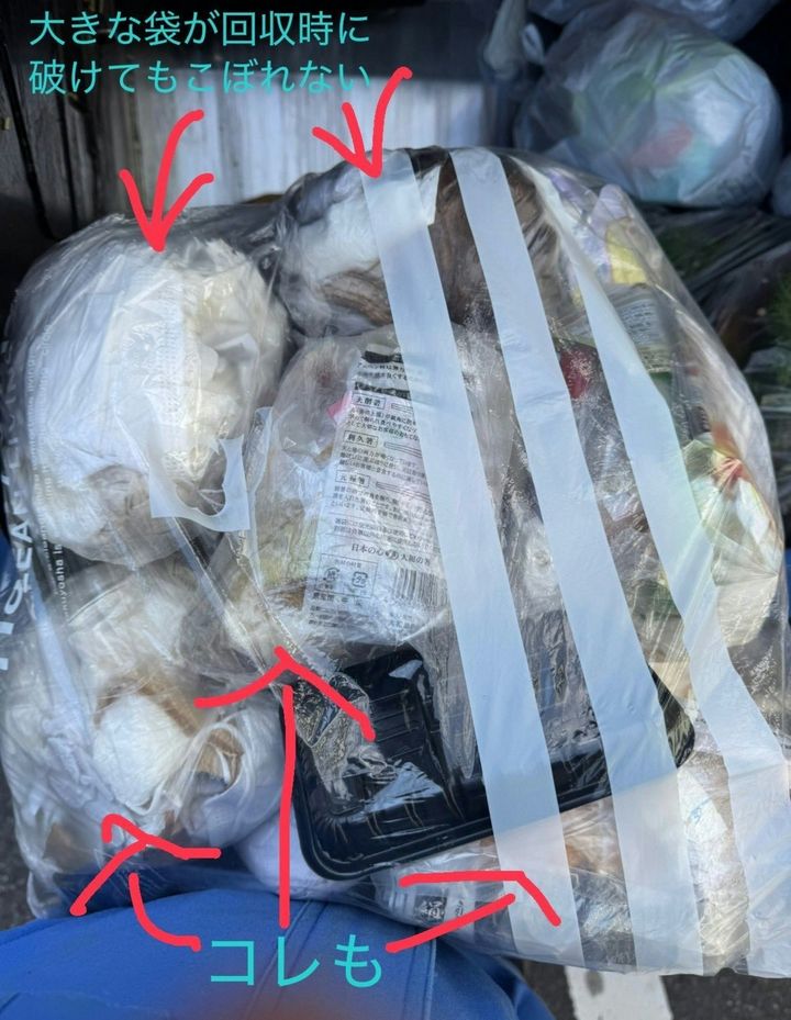 僕の好きな可燃ごみの出し方はコレです。大きな袋に直接ごみを入れないで、小さな袋にごみを入れて小分けのようになっていると嬉しくなります。理由は回収時に大きな袋が破けて、ティッシュや生ごみが清掃車からこぼれるので、コレだと拾うのも簡単で助かります! X「マシンガンズ滝沢」(https://x.com/takizawa0914/status/1873501417832681779,2025年2月19日最終閲覧)