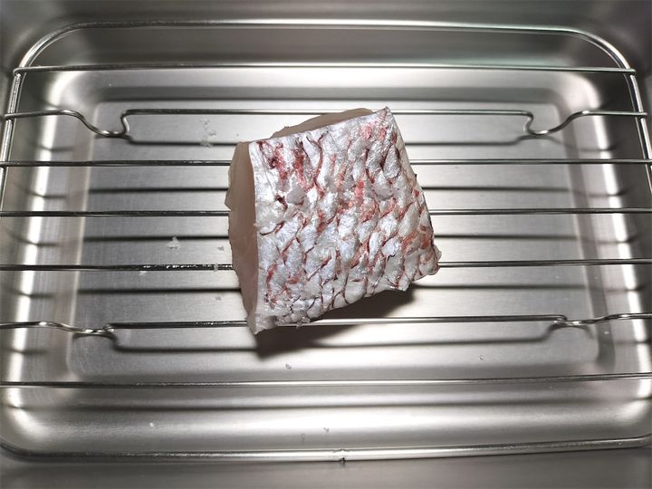 1. 鯛の切り身に塩を振って皮目を炙ります。