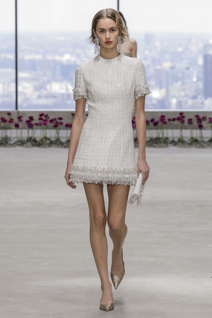 上品&クラシックな印象を放つツイードのミニドレスは、袖と裾にラインストーンとクリスタルの装飾が施されて。ウエディングはもちろん、お呼ばれやデートにも使えそうな一着です。