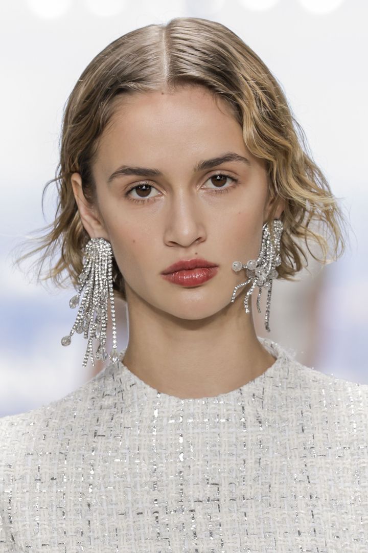 ラインストーンとパールがフリンジのように揺れるボリューミーなイヤリング。これひとつで顔まわりがグッと華やかに見え、装いがパーティムードにシフト。