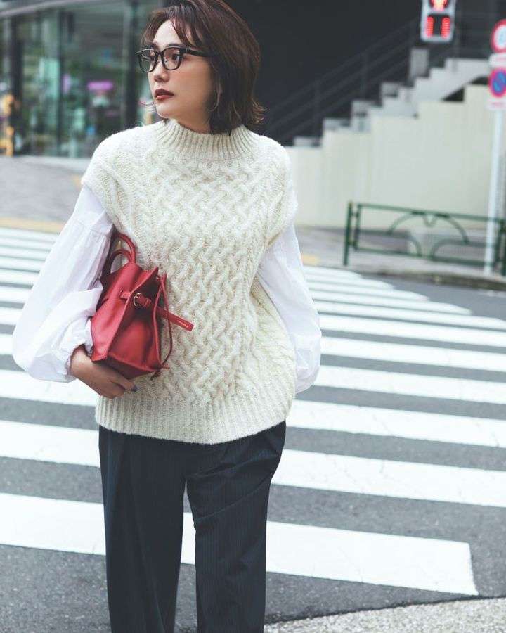 ニットベストとブラウスのセット¥16,940(Mila Owen/MilaOwen ルミネ新宿 2店)パンツ¥15,400(ラ トータリテ/ラトータリテ 有楽町マルイ店)バッグ¥16,500(LOWELL things/アバハウス インターナショナル オンラインストア)スニーカー¥12,100(プーマ/アーバンリサーチ ドアーズルミネ新宿店)メガネ¥11,000(OWNDAYS)