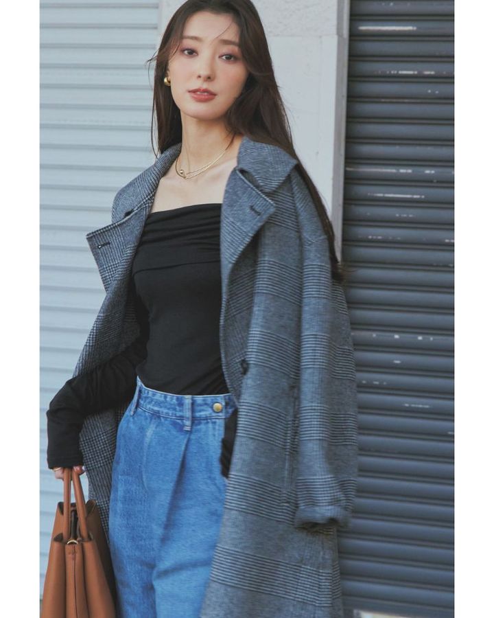 アシメオフショルトップス¥9,900(FRAY I.D/FRAI I.D ルミネ新宿 2 店)コート¥29,000(PLST)デニムパンツ¥29,700(サージ/essence of ANAYI)バッグ¥391,600ブーツ¥119,900(ともにトッズ/トッズ・ジャパン)チョーカー¥3,630(アネモネ/サンポークリエイト)ピアス¥13,360(DAUGHTERSJEWELRY)